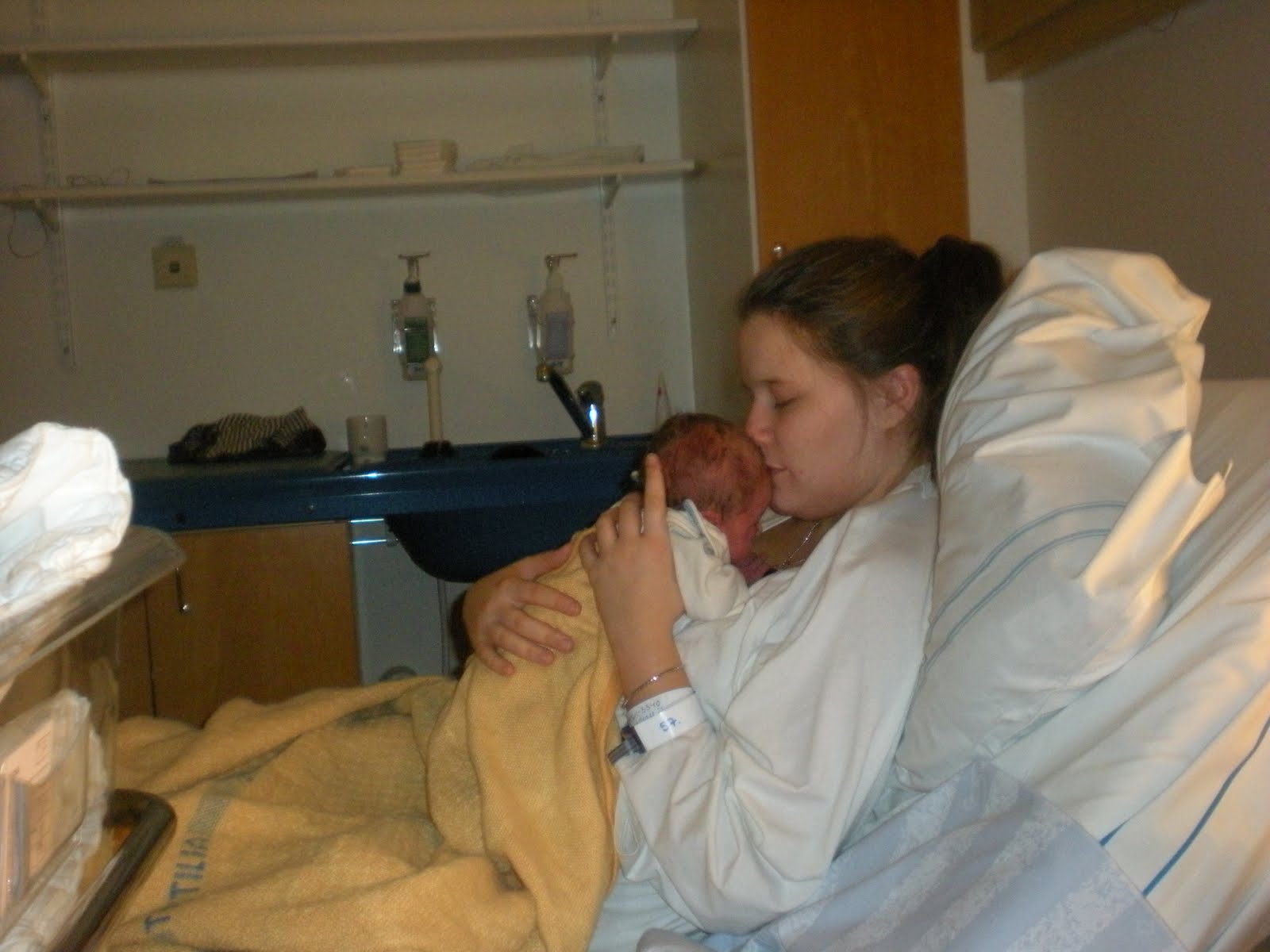 När hon kom in sa hon att bebisen inte kunde vara på väg, jag hade ju inte varit tillräckligt öppen för ett par minuter sedan. (Det är nämligen så att när bebisen är på väg ut, så känns det som man har väldigt bråttom till toaletten och att man nog bra allt gärna skulle vilja stanna där ett tag!). Men hon kollade efter och "Oj! Här kommer ju bebisen!"